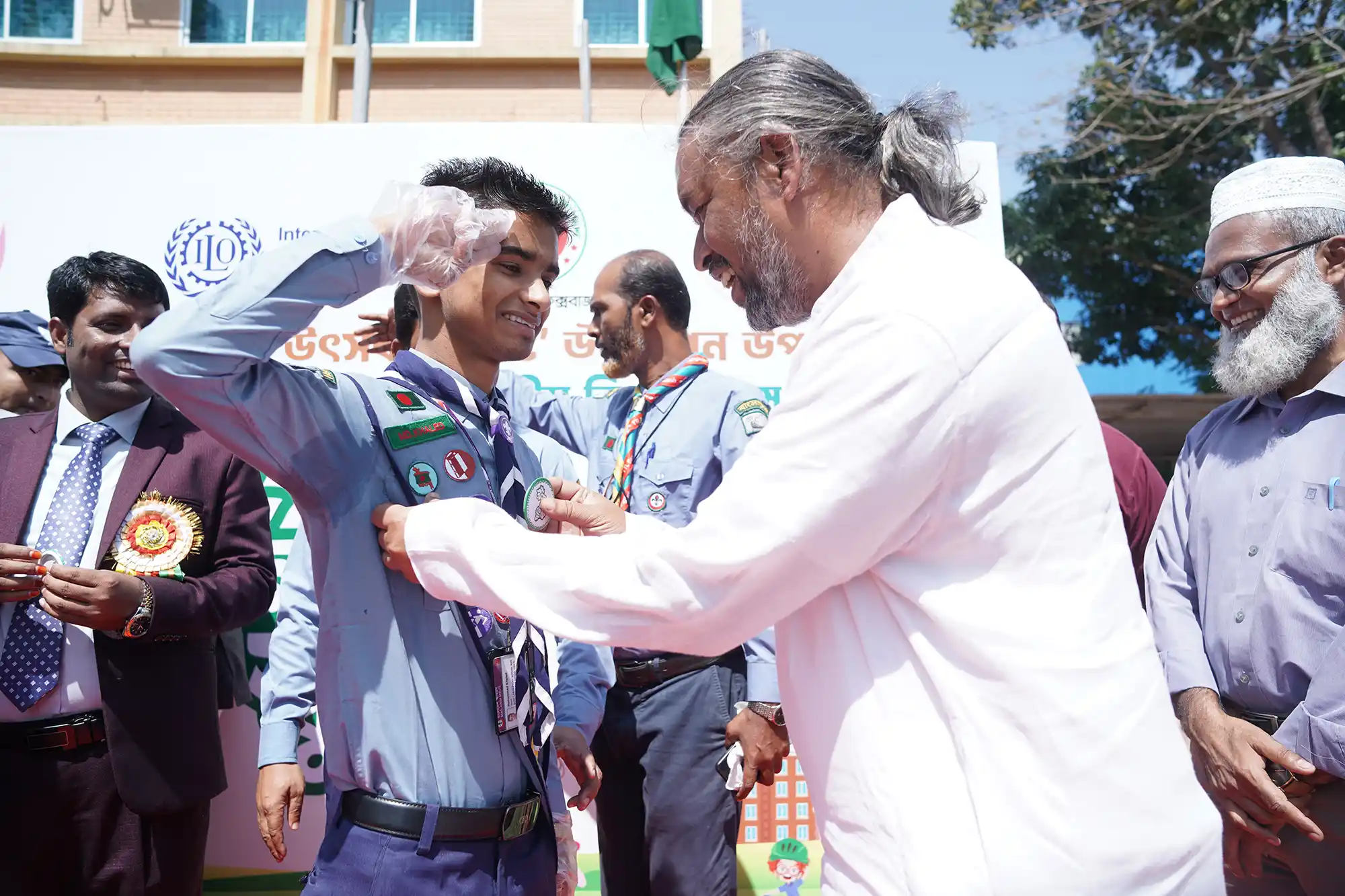 Md. Tariqul Haque, Chairman of Enroute International Limited, is seen putting a badge on a volunteer at the BIAM Laboratory School & College